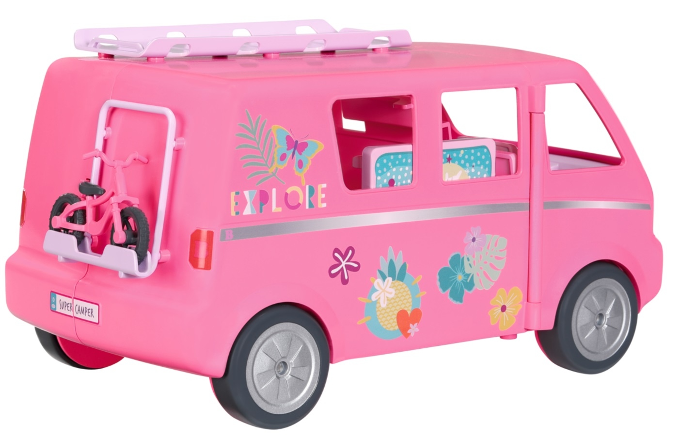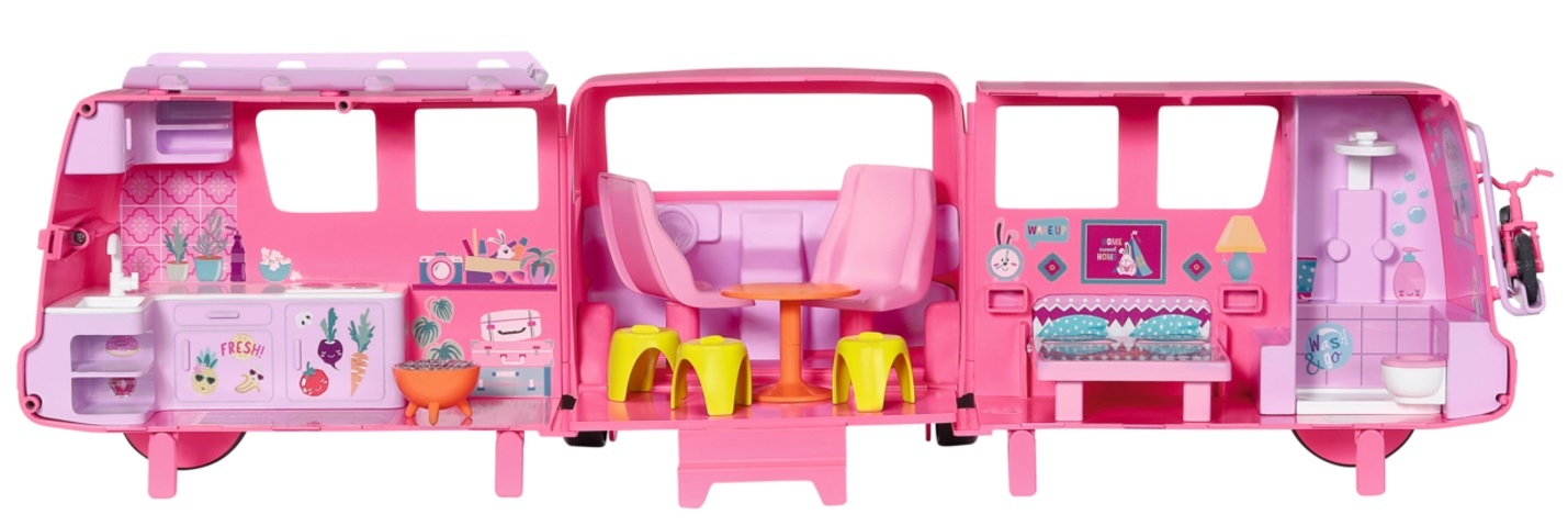 • 🚐 Rozkładany Pojazd: Kamper otwiera się, ujawniając w pełni wyposażone wnętrze do zabawy.