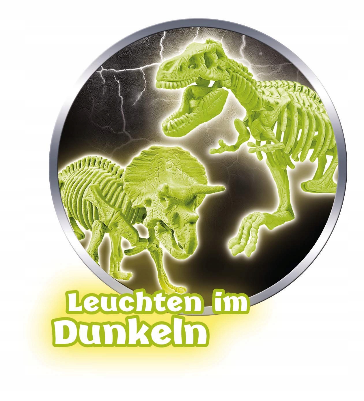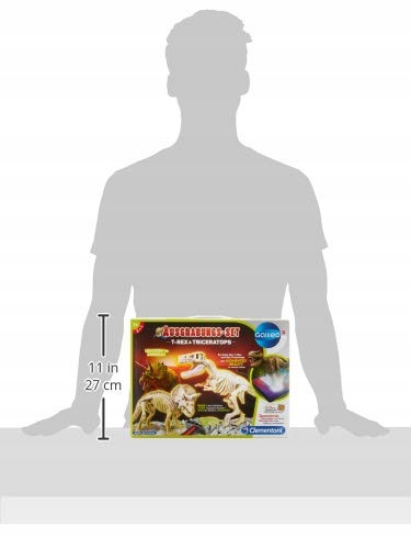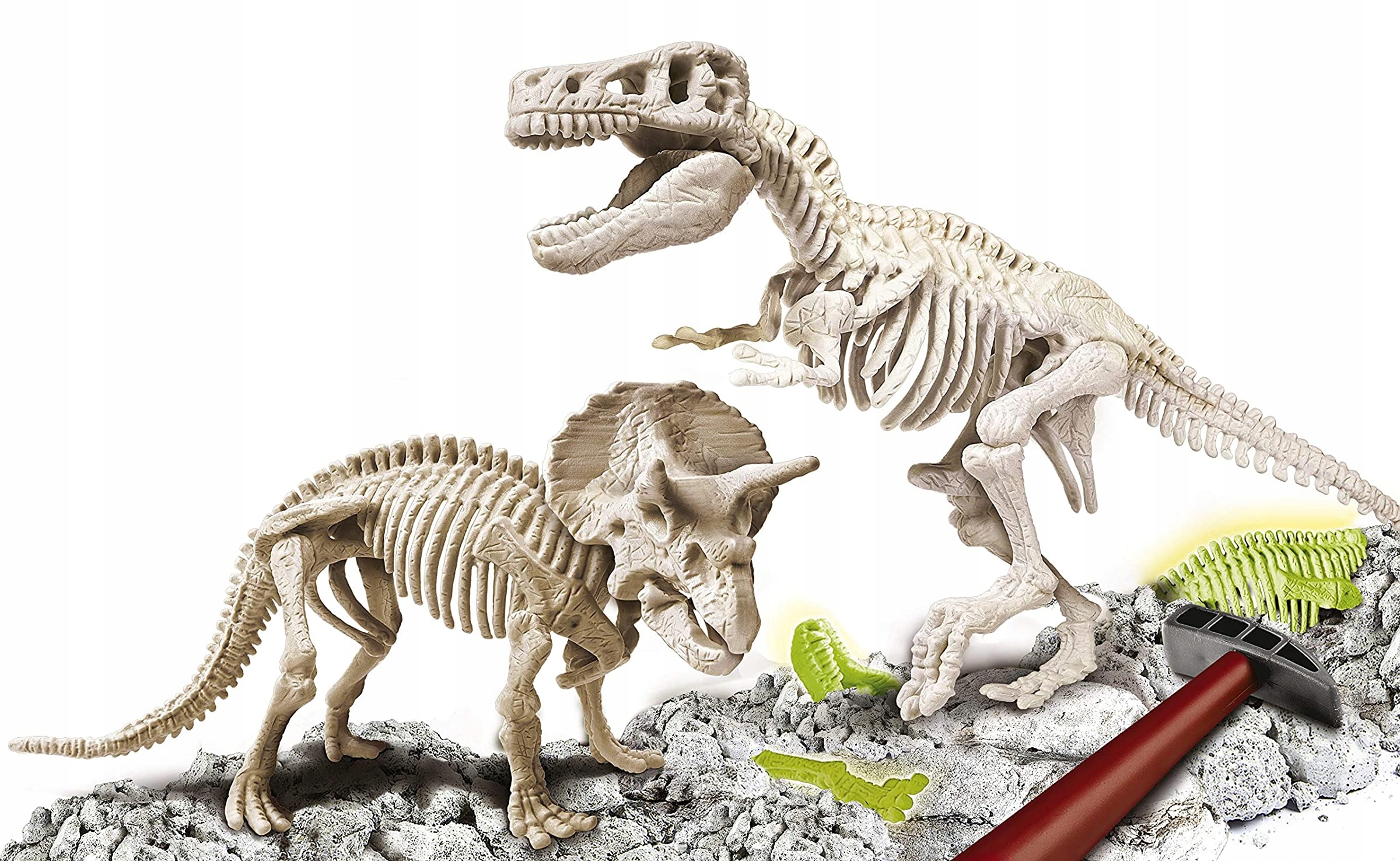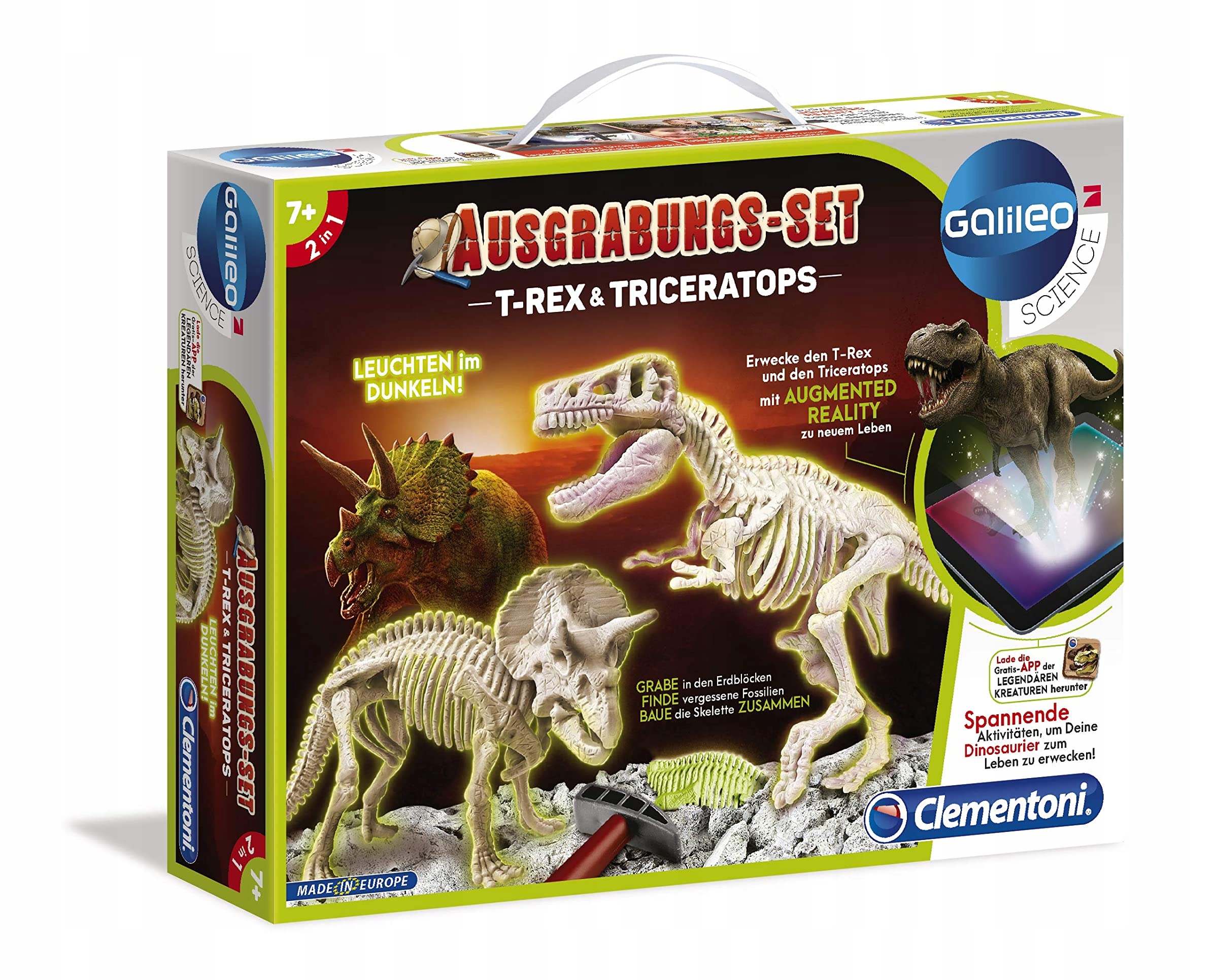 Zabawa z zestawem Clementoni Galileo Science T-Rex & Triceratops zaczyna się od wielkich emocji towarzyszących rozkuwaniu bloku ziemi. Dziecko, używając dołączonych narzędzi, musi ostrożnie odsłaniać kolejne elementy szkieletów Tyranozaura i Triceratopsa. Po wydobyciu wszystkich części, młody naukowiec składa je w całość, tworząc realistyczne modele dinozaurów. Co najważniejsze, szkielety zostały wykonane z materiału fluorescencyjnego, co oznacza, że po naświetleniu będą świecić w ciemności, stając się atrakcyjnym elementem wystroju pokoju każdego fana prehistorii.