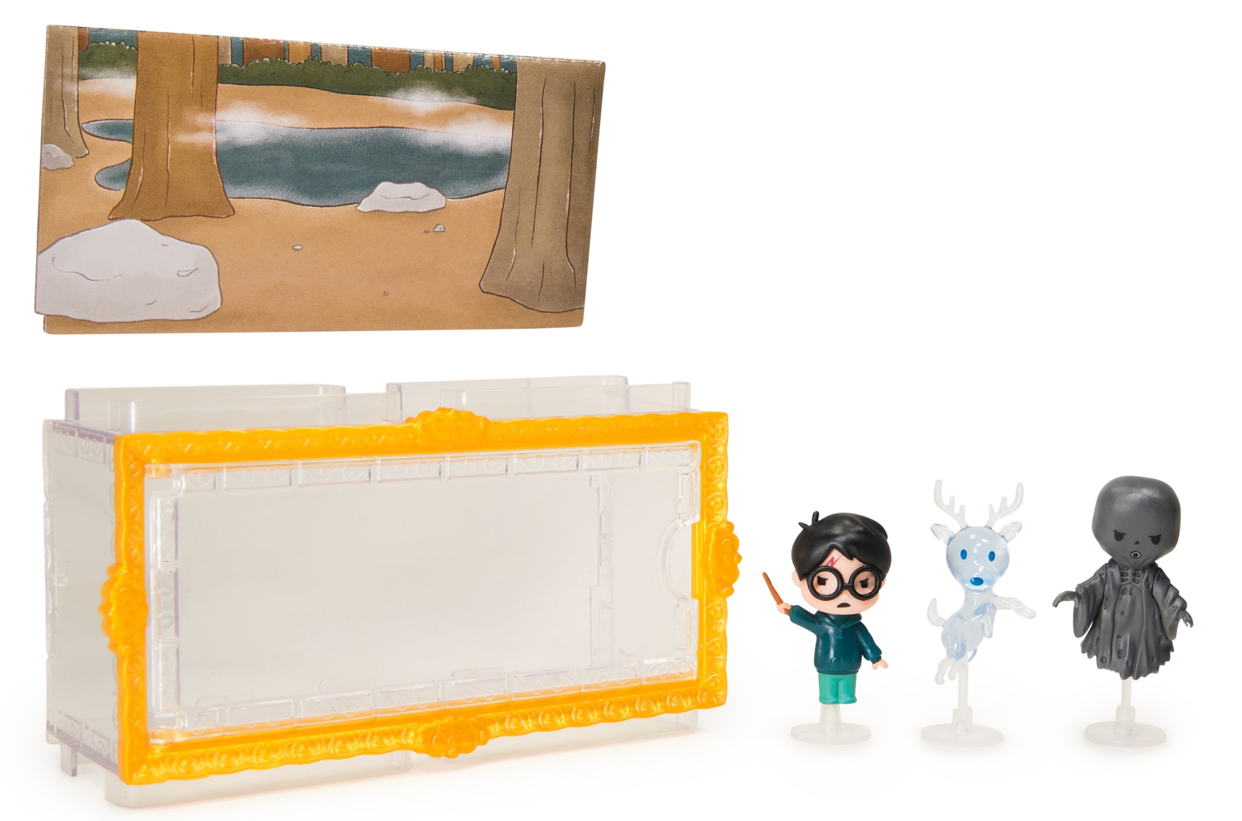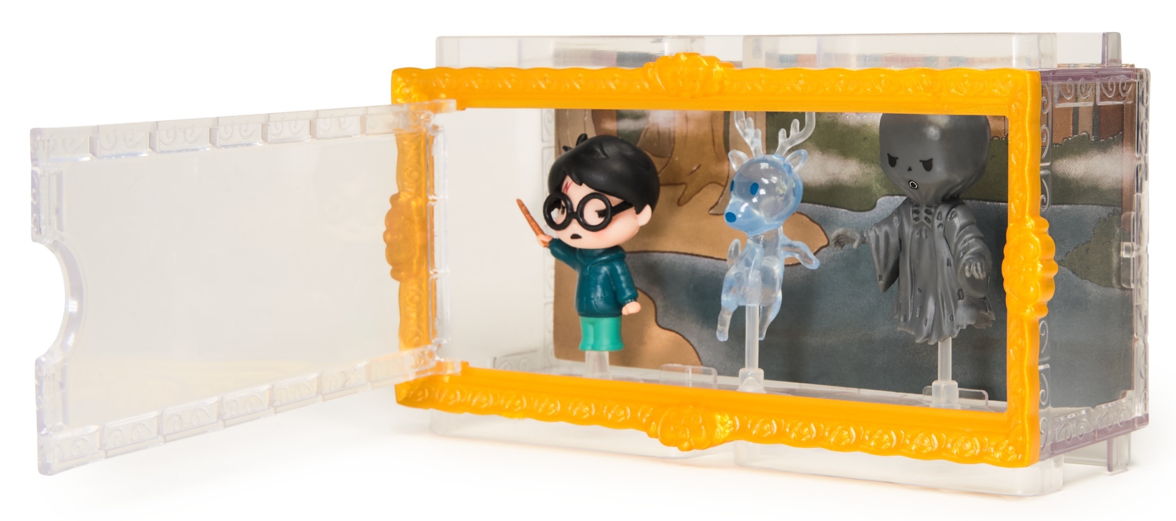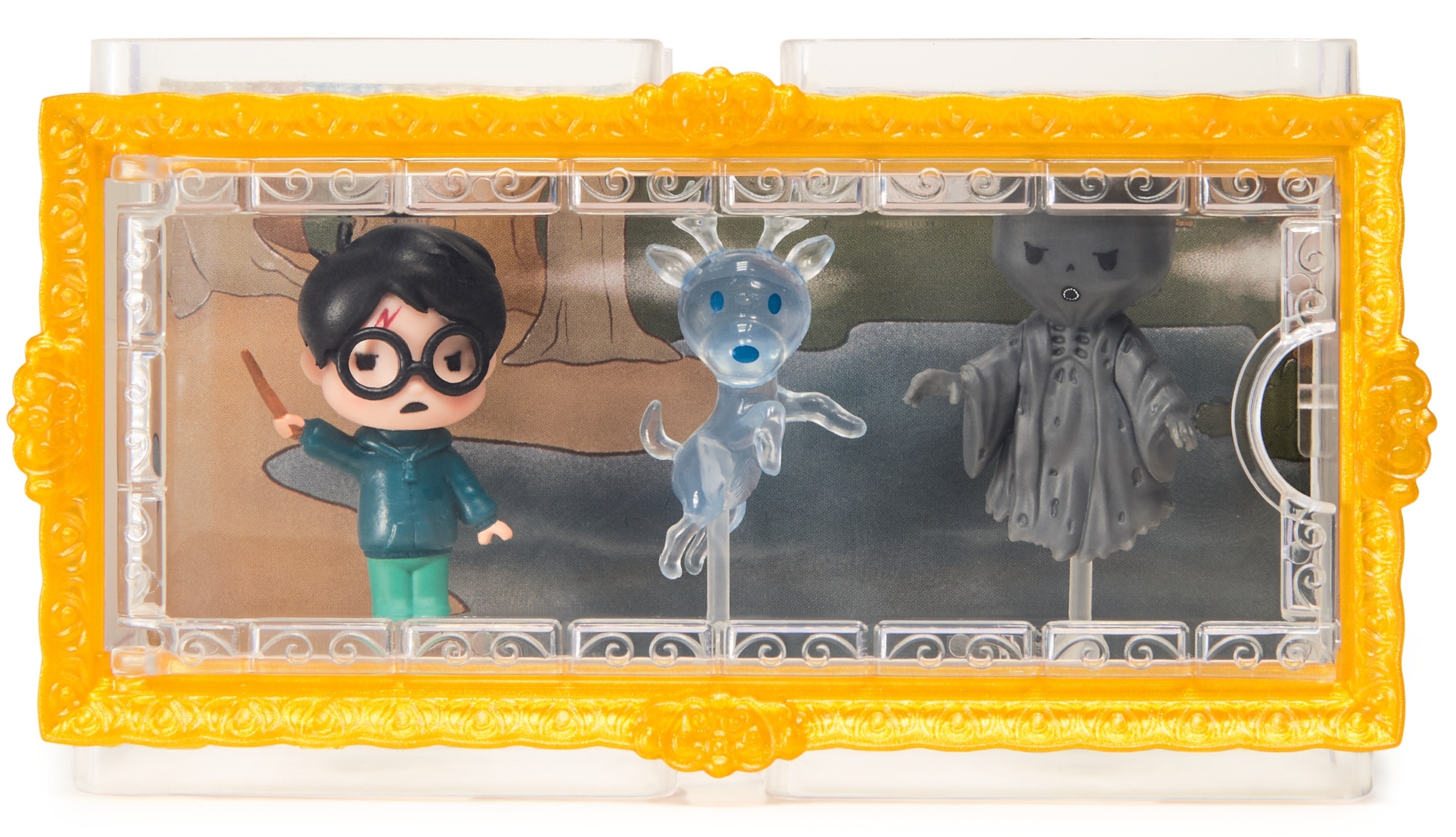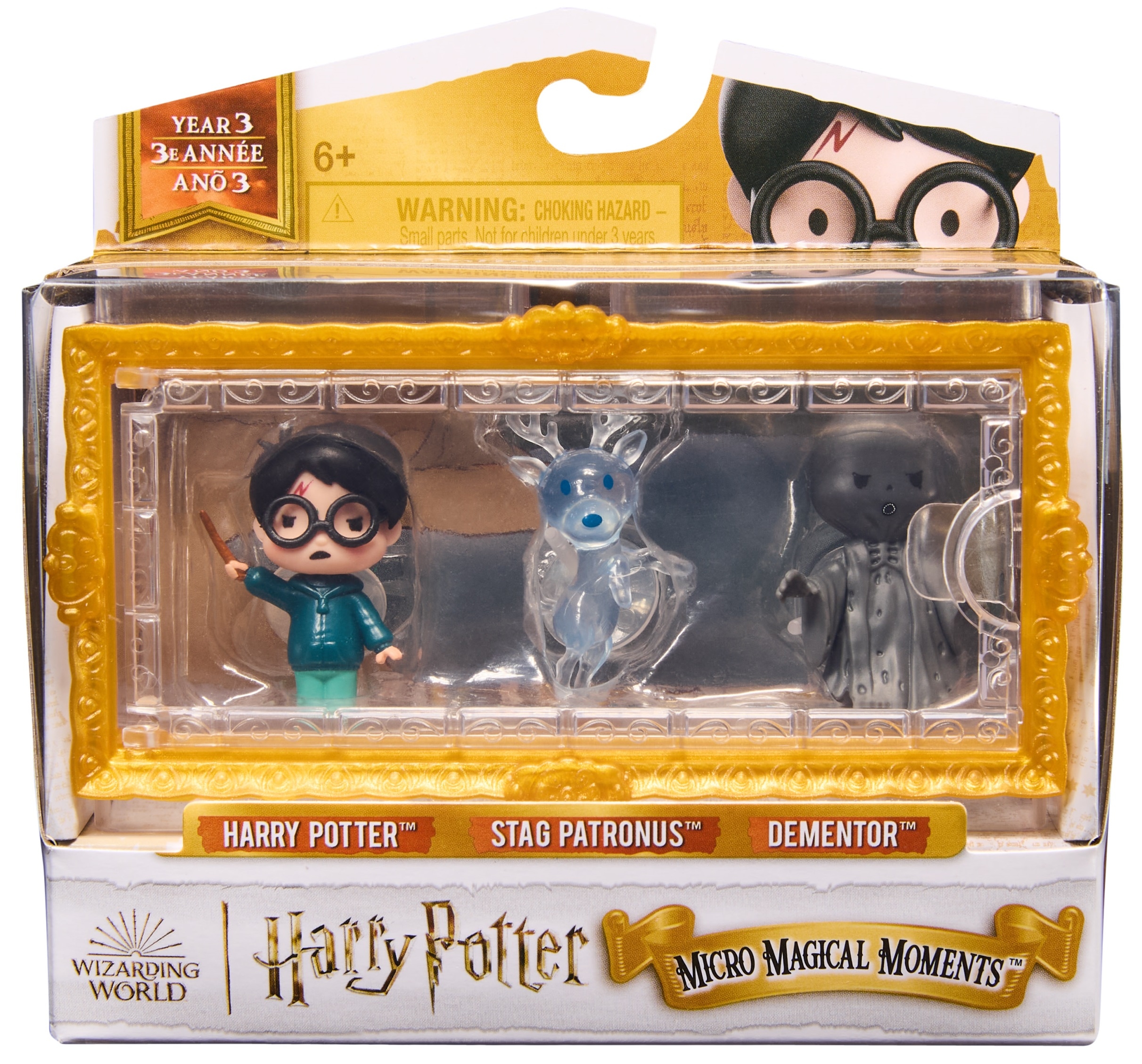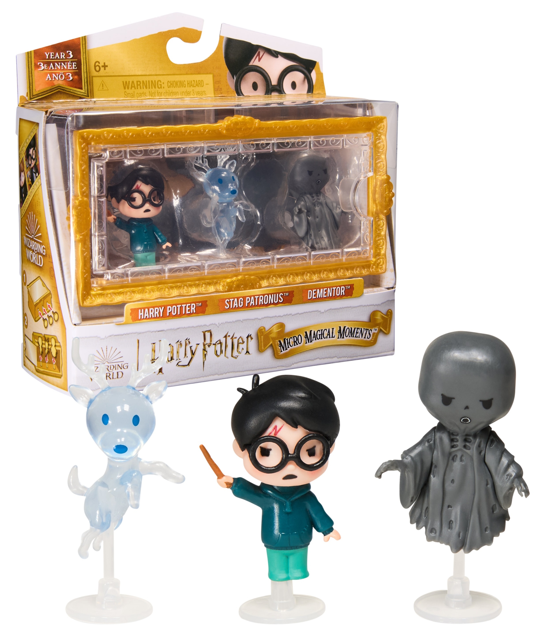Zestaw Harry Potter Patronus Dementor Figurki Micro Moments od renomowanego producenta Spin Master to dowód na to, że prawdziwa magia nie zależy od rozmiaru. Figurka Harry’ego w pełnym skupieniu, mroczna, unosząca się postać Dementora oraz majestatyczny jeleń tworzą trójwymiarowy obraz, który zachwyca precyzją. Figurki są na stałe zamontowane w gablotce, co zapewnia ich bezpieczeństwo i ułatwia utrzymanie czystości – Twoja kolekcja zawsze będzie wyglądać nienagannie, chroniona przed kurzem pod przezroczystą osłoną.
