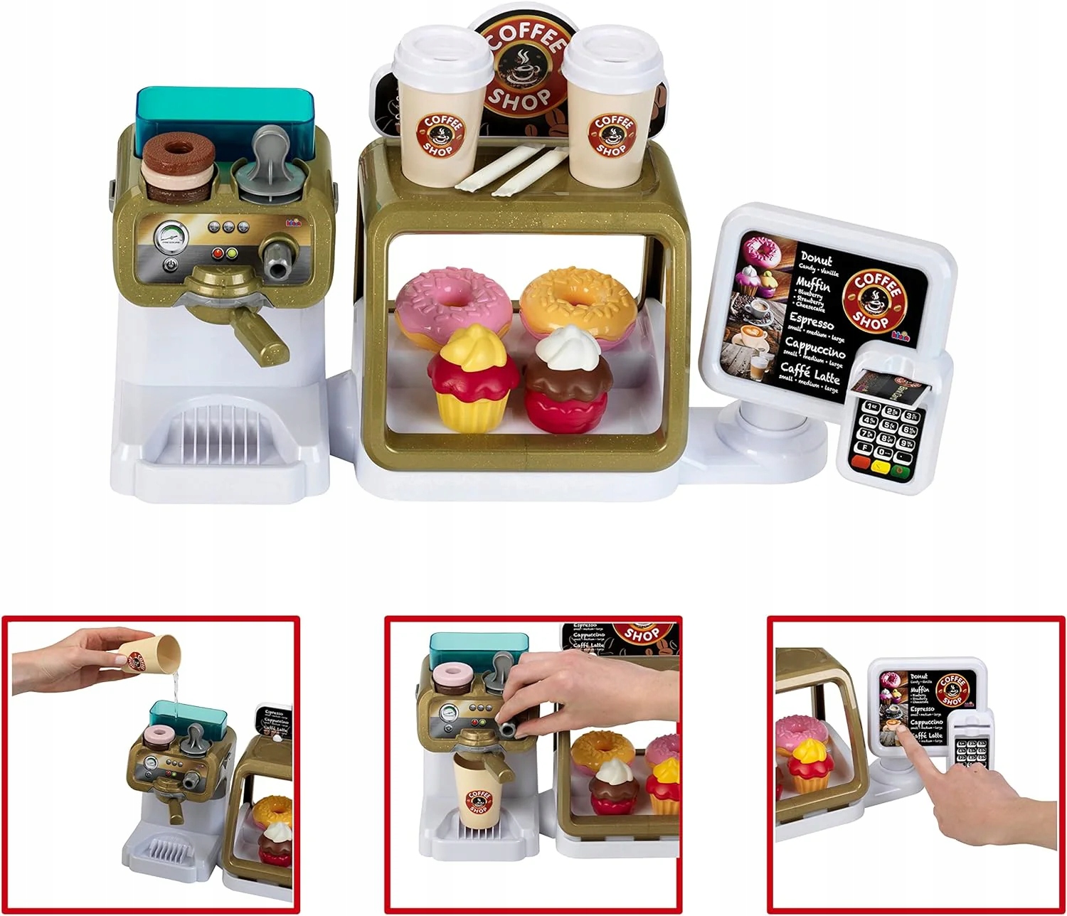 Głównym punktem zestawu Kawiarnia Theo Klein jest nowoczesny ekspres do kawy. Urządzenie posiada funkcję przepływu wody oraz wydaje dźwięki typowe dla parzenia prawdziwego napoju, co sprawia, że dzieci czują się jak w prawdziwym lokalu. Panel sterowania z przyciskami uczy rozpoznawania różnych rodzajów kaw, a dołączone akcesoria, takie jak kolba czy kubki na wynos, pozwalają na odgrywanie pełnego procesu przygotowania zamówienia. Całość dopełnia estetyczna lada, na której można wyeksponować babeczki i donaty, kusząc potencjalnych gości kawiarni.