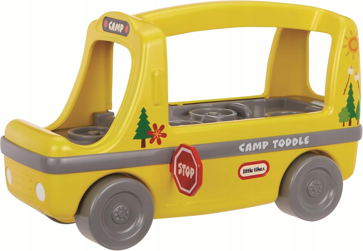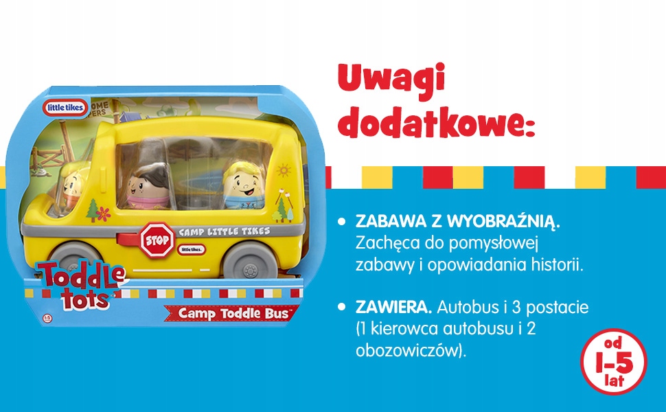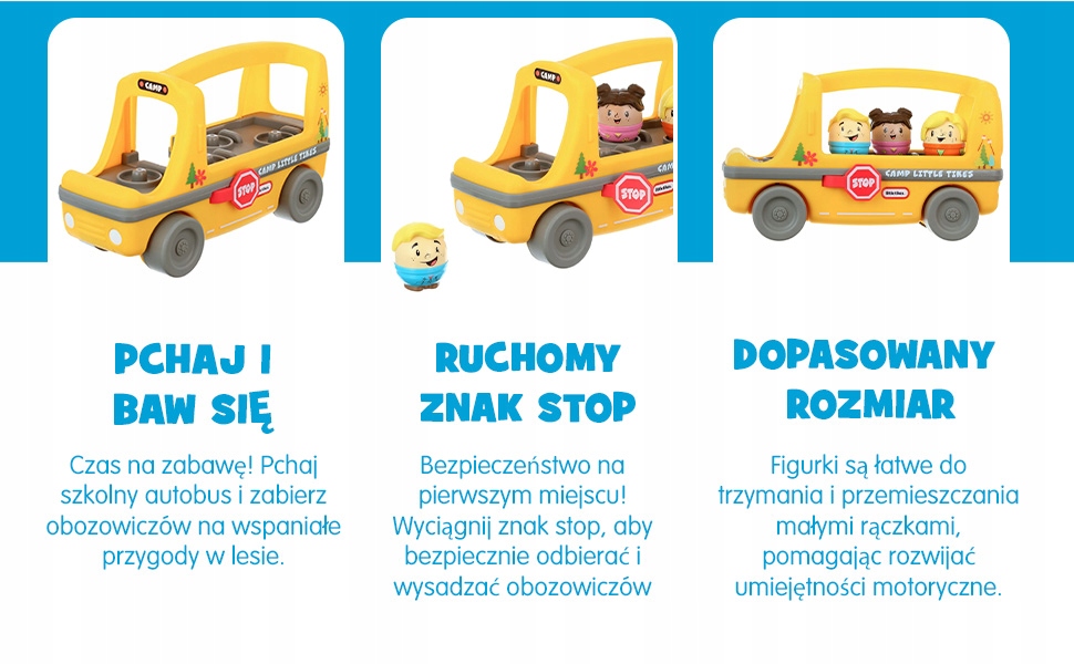 W sercu Little Tikes Autobus Szkolny drzemie dbałość o detal, która zachwyci każdego małego kierowcę. Autobus posiada charakterystyczne, uśmiechnięte „oczy” na przedniej masce, co buduje pozytywne skojarzenia z pojazdem i sprawia, że zabawka jest postrzegana jako przyjazny bohater. W zestawie znajdują się trzy figurki Toddle Tots: sympatyczny kierowca w czapce oraz dwoje dzieci z plecakami. Figurki mają unikalny, pękaty kształt, który zapobiega ryzyku połknięcia i jest idealnie dopasowany do fizjonomii dłoni rocznego dziecka. Co ważne, figurki te są kompatybilne z innymi pojazdami serii, takimi jak wywrotka czy statek UFO, co pozwala na nieograniczone rozbudowywanie świata przygód. To luksusowy zestaw startowy, który porządkuje przestrzeń zabawy i wprowadza ład w dziecięcym kąciku transportowym.